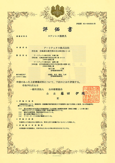 一般社団法人 公共建築協会[ステンレス製建具評価]を取得。