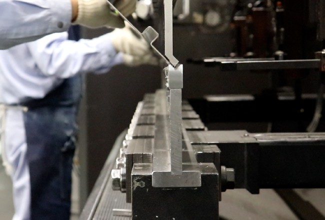 ⑤曲げ加工 V溝部もしくはゲージを使用し板を曲げて指示通りの形状にします。 -