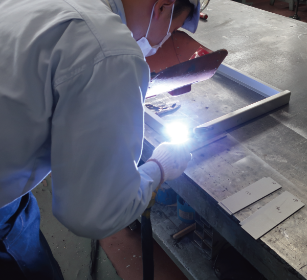 ⑥組立加工 ビス止め、溶接で曲げ材を組み上げて図面と同じ形状にします。 -